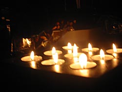 Ni lys på et bord. |